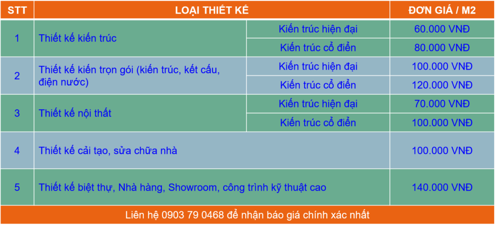 BẢNG BÁO GIÁ THIẾT KẾ NHÀ PHỐ