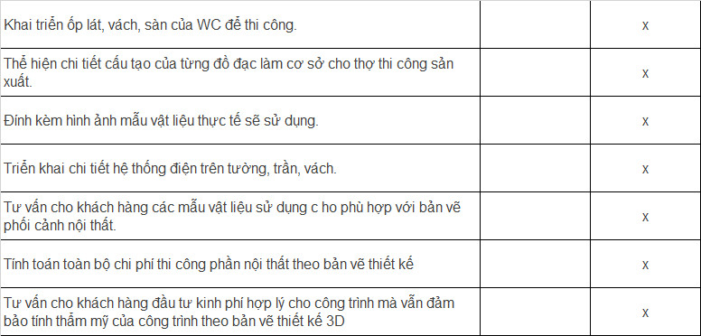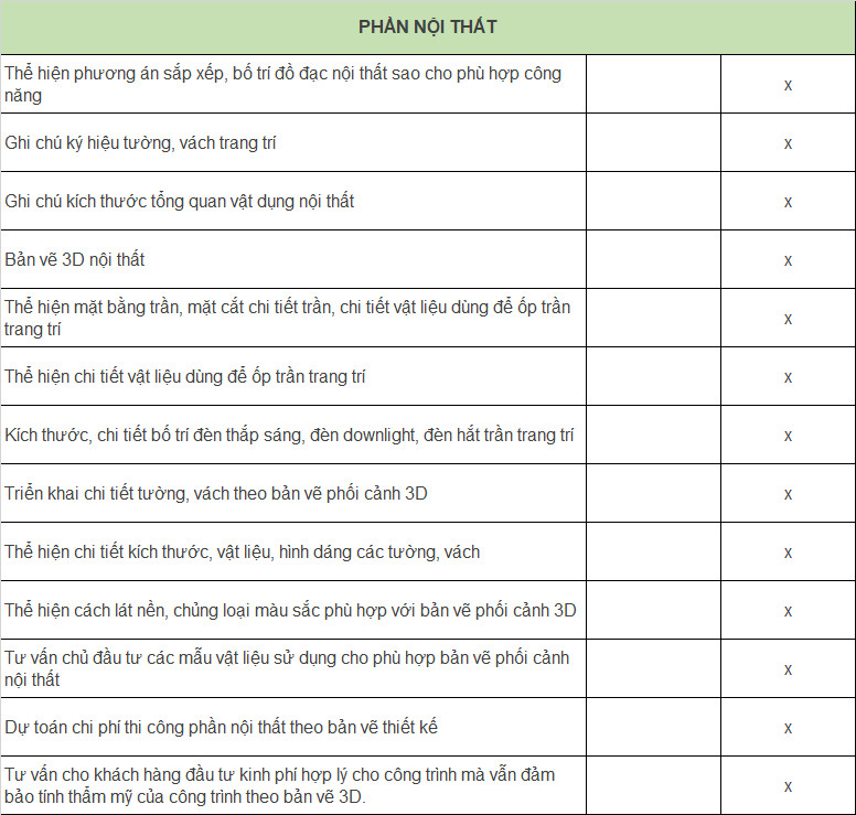 - Hồ sơ thiết kế kỹ thuật thi công, trang trí nội thất không bao gồm thiết kế chi tiết mẫu tủ, giường, bàn ghế và các vật dụng khác.
